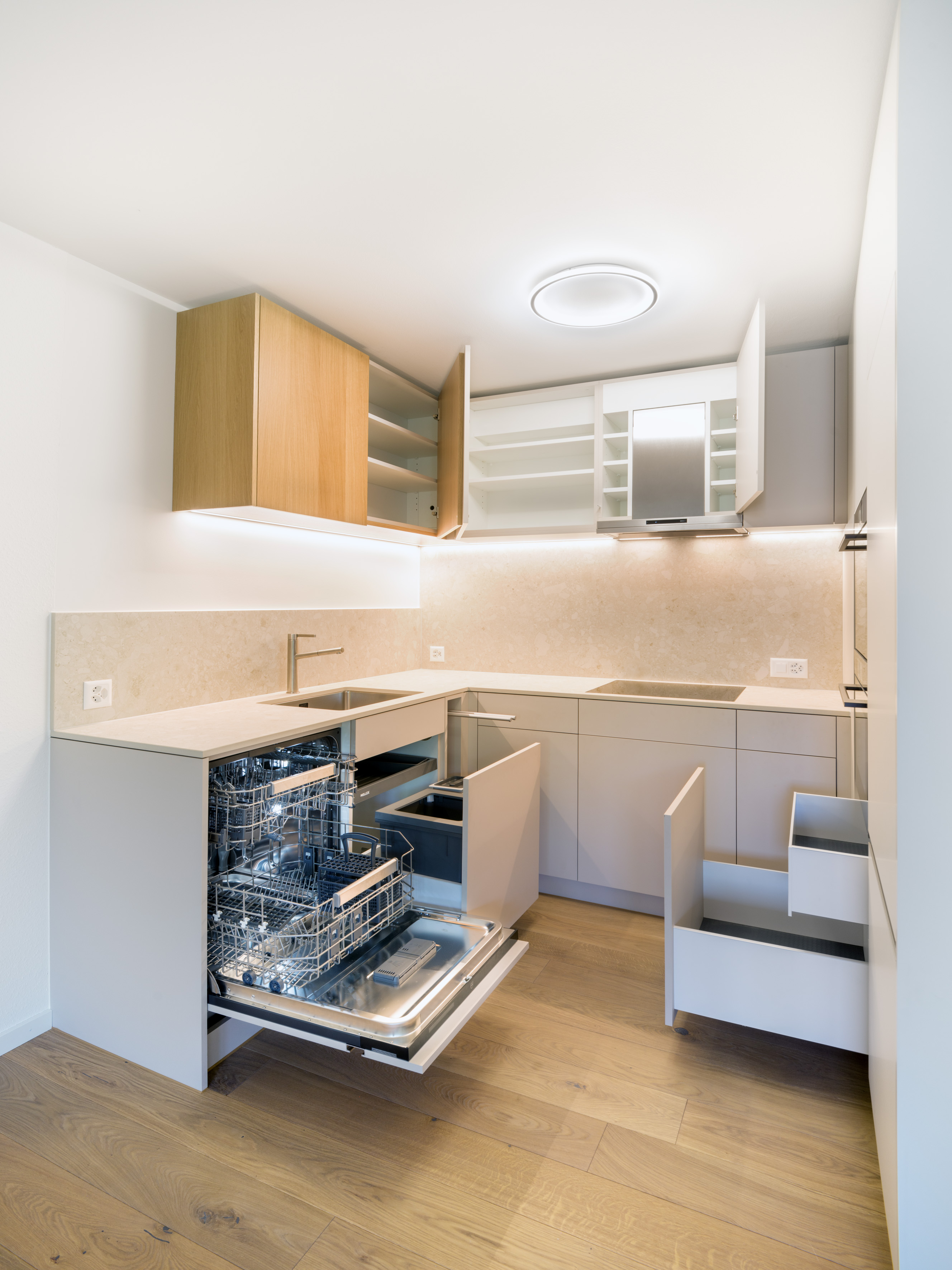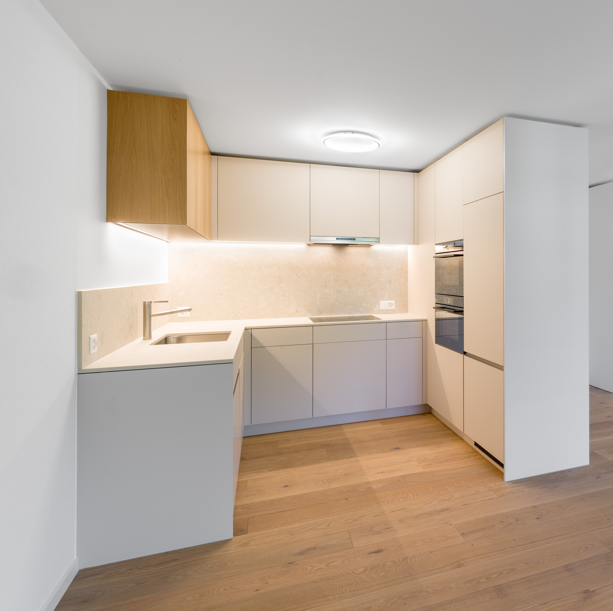 Diese massgefertigte Küche kombiniert warmes Holz mit mattem Beige und klarer Linienführung. Hochwertige Materialien und durchdachte Stauraumlösungen schaffen eine moderne, harmonische Wohnatmosphäre.