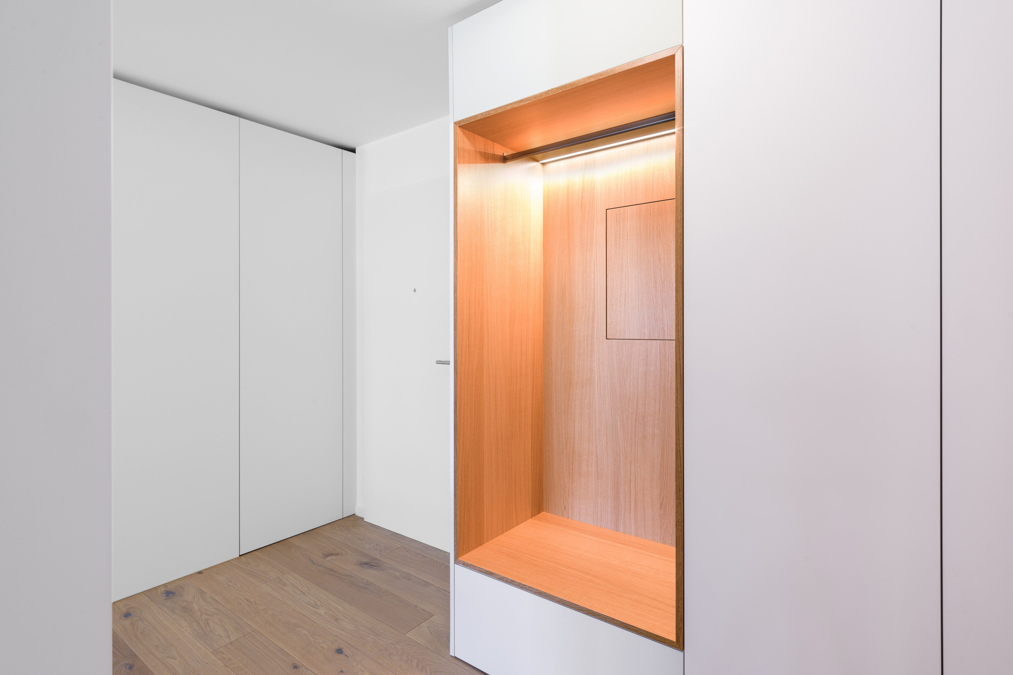 Die moderne Garderobe mit weissen Fronten und beleuchteter Holznische fügt sich perfekt ins Wohnkonzept ein. Als Teil des Gesamtdesigns entsteht ein stimmiges, einladendes Ambiente.